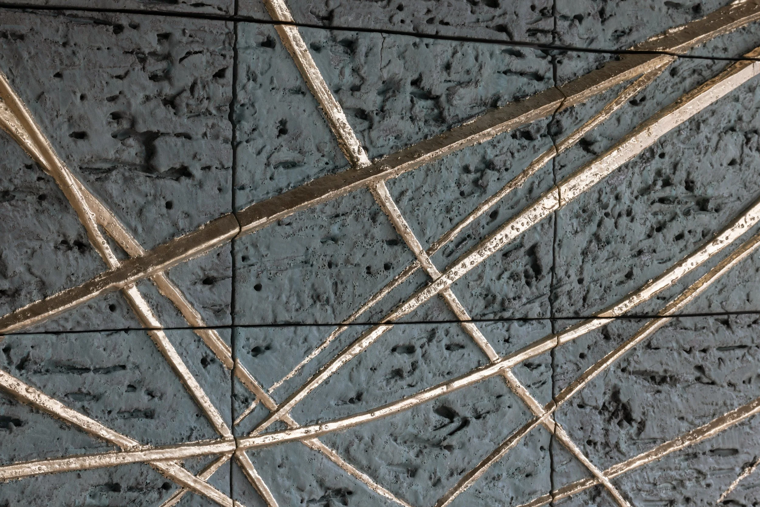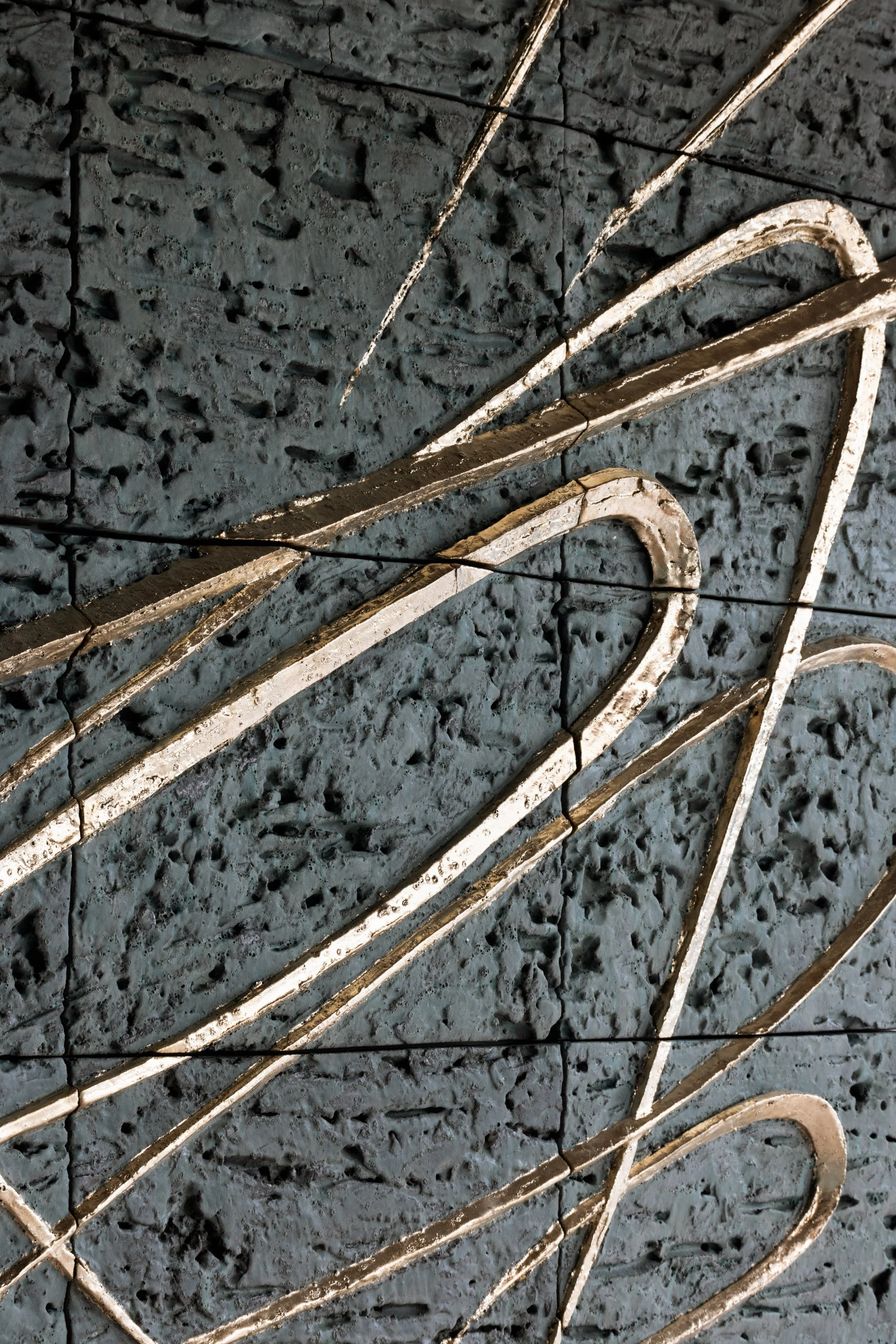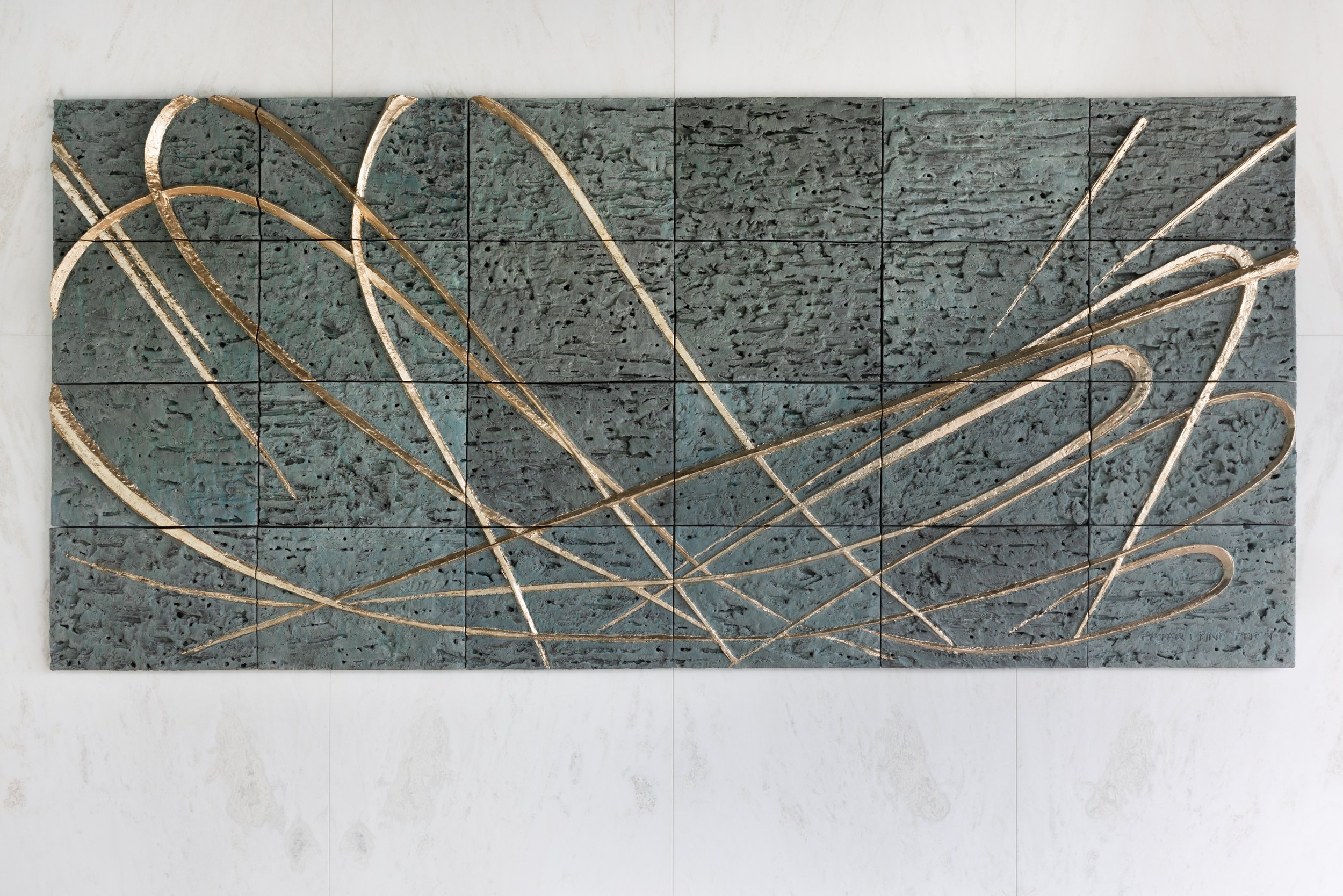 Custom ceramic stoneware sculpture moon gold-leaf details, approximately, 157” W x 79” H.
