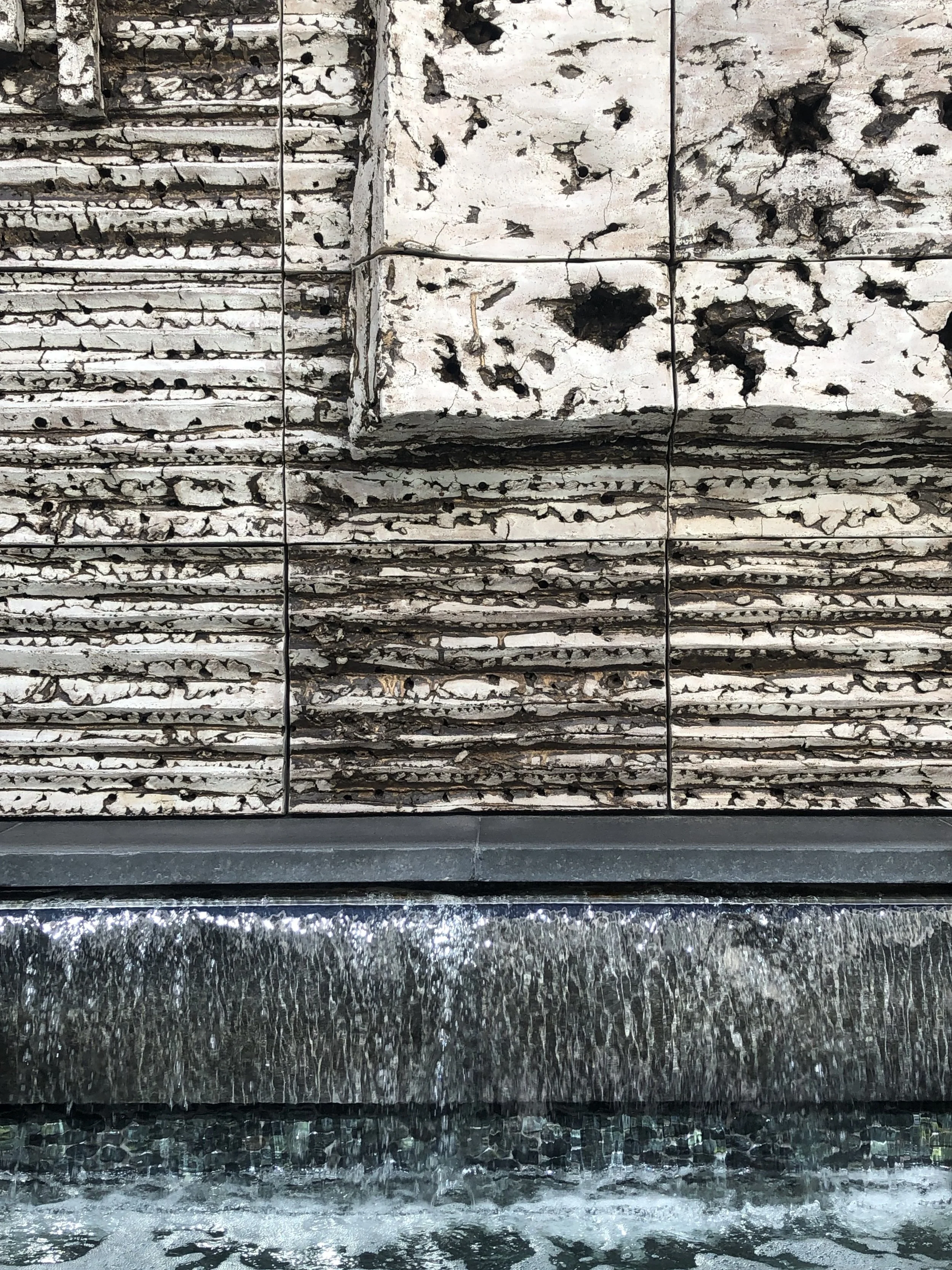 Custom ceramic stoneware sculpture in a white and bronze glaze, approximately 144" H x 96" W.